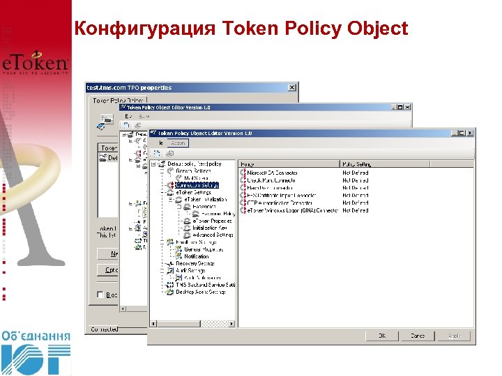Редактор Token Policy Object (TPO) • • • Установка всех политик TMS Если политика может быть установлена как Not Defined, то определение берётся из вышестоящей политики Установки включают: – General Settings/Mail Server Settings – Connectors Settings – e. Token Settings (Initialization Settings, Password Settings, e. Token Properties – Enrollment Settings – e. Token recovery options – Audit Settings – Desktop Agent Settings