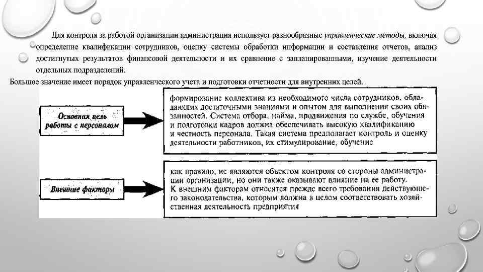 • Система внутреннего контроля коммерческой организации Один из важнейших элементов механизма управления — внутрихозяйственный (внутренний) контроль. Французская национальная компания бухгалтеров ревизоров трактует внутренний контроль как комплекс мер безопасности, определяемый руководством в целях обеспечения защиты имущества, правильности и достоверности бухгалтерских записей, согласованного и эффективного осуществле ния операций, соответствия принимаемых решений политике руководства.