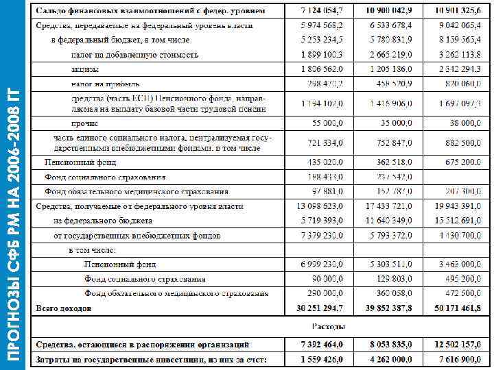 (тыс. руб. ) 2006 2007 2008 ДИНАМИКА САЛЬДО С ФЕДЕРАЛЬНЫМ УРОВНЕМ ВЛАСТИ: 7 124 054 10 900 042 10 901 325 53, 02% [–] СРЕДСТВА, ПЕРЕДАВАЕМЫЕ В ФЕДЕРАЛЬНЫЙ БЮДЖЕТ 5 253 234 5 780 831 8 159 565 55, 32% [–] ЧАСТЬ ЕСН, ЦЕНТРАЛИЗУЕМАЯ В ГОСУДАРСТВЕННЫХ ВНБФ 721 334 752 847 882 500 22, 34% [+] СРЕДСТВА, ПОЛУЧАЕМЫЕ ОТ ФЕДЕРАЛЬНОГО БЮДЖЕТА 5 719 393 11 640 349 15 512 691 171, 23% [+] СРЕДСТВА, ПОЛУЧАЕМЫЕ ОТ ГОСУДАРСТВЕННЫХ ВНБФ 7 379 230 5 793 372 4 430 700 ИТОГО ДОХОДОВ БАЛАНСА 30 251 295 39 852 388 50 171 462 39, 96% 65, 85%