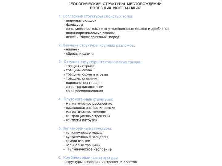 Геологическая структура – пространственное расположение и взаимоотношение комплексов горных пород, возникшее главным образом в результате тектонических движений, изменения первичного залегания горных пород, связанного с их деформациями и другими явлениями. Тела, образованные в земной коре различными породами, называют структурными формами (первичные: пласт, лавовый поток, шток, дайка и др. ; вторичные: складка, сдвиг, трещина и др. ). Геологическая структура может быть пластовой, трещинной, складчатой, вулканической, комбинированной и т. п. ) Структура месторождения – совокупность элементов геологической структуры, определяющих форму месторождения, то-есть морфологию рудных тел, и влияющих на их локализацию. В понятие «структура месторождения» входит сочетание в пространстве различных пород и руд, поверхностей их их ограничений (слоистости, контактов и пр. ), линейных, плоскостных и др. текстур. Структурный контроль оруденения – закономерная приуроченность тел полезных ископаемых к определенным структурным элементам (пластовым, складчатым и др. ) или к их комбинации в сочетании с благоприятными или неблагоприятными для рудоотложения породами. Такие структуры называют рудоконтролирующими, среди которых различают рудоопределяющие и рудовмещающие. Среди рудоконтролирующих структур выделяют также дорудные, внутрирудные и послерудные.