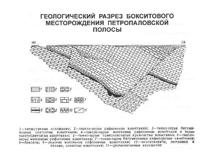 Конседиментационная депрессия (мульда), вмещающая железорудные тела на Керченском месторождении : 1 – лессовидные суглинки, 2 – пески и алевролиты, 3 – глины песчаные, 4 – глины, 5 – икряные, обломочные и обломочнооолитовые руды, 6 - табачные оолитовые руды, 7 – известняки.