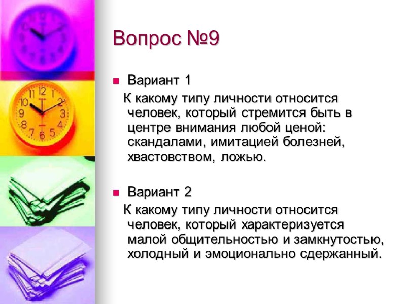 Вопрос №9 Вариант 1 К какому типу личности относится человек, который стремится быть в центре внимания любой ценой: скандалами, имитацией болезней, хвастовством, ложью. Вариант 2 К какому типу личности относится человек, который характеризуется малой общительностью и замкнутостью, холодный и эмоционально сдержанный.
