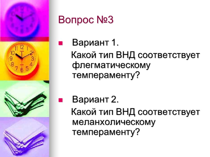 Вопрос №3 Вариант 1. Какой тип ВНД соответствует флегматическому темпераменту? Вариант 2. Какой тип ВНД соответствует меланхолическому темпераменту?