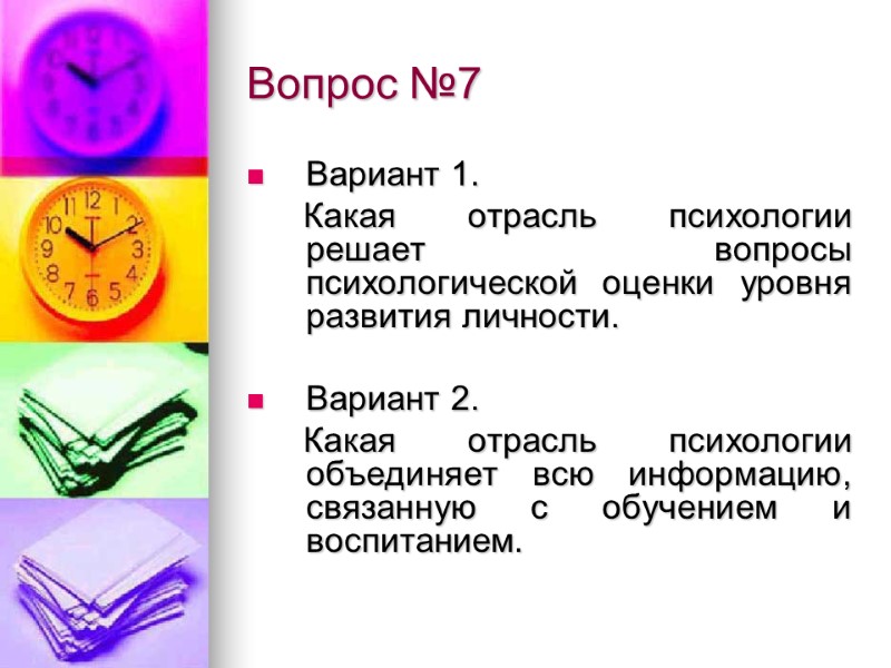 Вопрос №7 Вариант 1. Какая отрасль психологии решает вопросы психологической оценки уровня развития личности. Вариант 2. Какая отрасль психологии объединяет всю информацию, связанную с обучением и воспитанием.