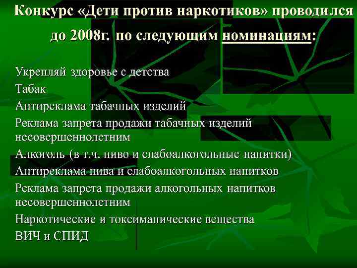 Конкурс с 2011 года проводится в номинациях: 1 номинация – «РЕКЛАМА ЗДОРОВЬЯ» 2 номинация - «АЗБУКА ЗДОРОВЬЯ» 3 номинация – «ПРОПАГАНДА ЗДОРОВЬЯ» 4 номинация - «СЕМЬЯ ВЫБИРАЕТ ЗДОРОВЬЕ» 5 номинация - «ПЕДАГОГИЧЕСКАЯ КУЛЬТУРА: УКРЕПЛЯЕМ ЗДОРОВЬЕ ВМЕСТЕ!»