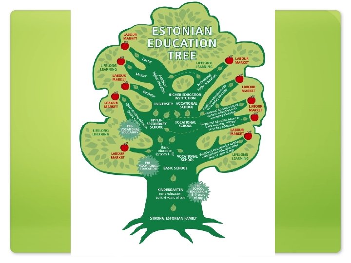 Развитие профессионального образования в Эстонии за последние 10 лет • Реформы начались в 1996 • Концептуальная база – 1998 • Закон о профессиональном учебном заведении - 1998 • План действия по развитию системы профессионального образования в Эстонии на 2001 -2004 гг. • План развития профессионального образования 2005 – 2008
