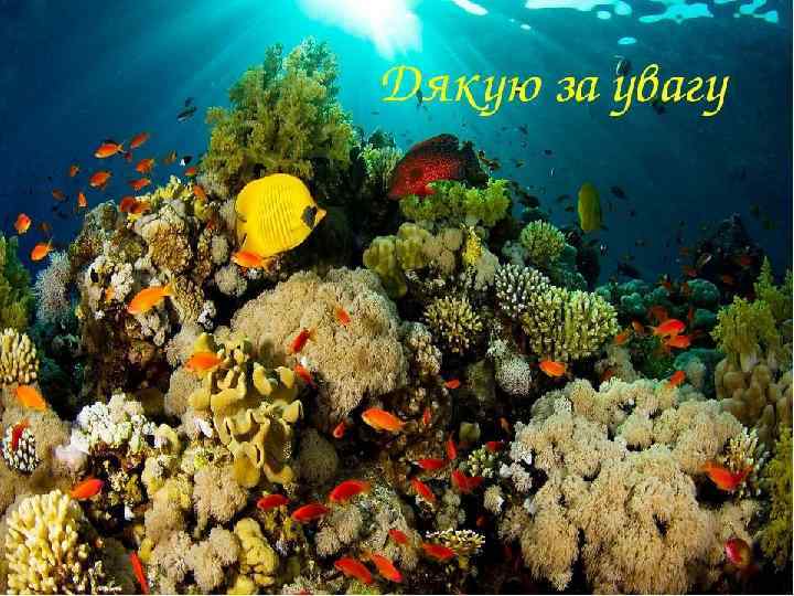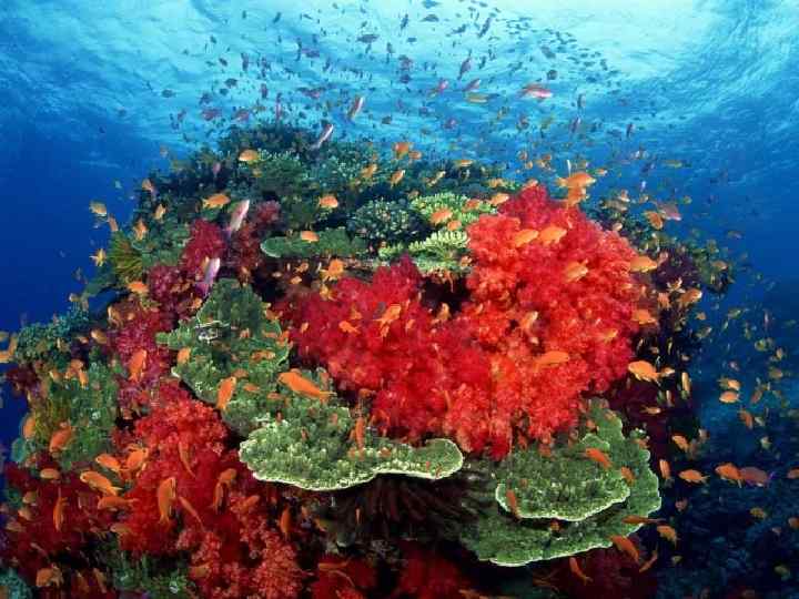 • Кораловий риф – це справжній оазис в океані. Кольори мешканців коралових рифів вражають уяву: сліпуче жовті, червоні, бузкові, зелені і т. д. Ці кольори дозволяють їм вправно маскуватися «під корали» , оскільки в коралових лісах їх на кожному кроці підстерігають вороги. Наприклад, хижі мурени – риби, гнучкі, як змії, які є грозою всіх дрібних жителів рифів. Вони можуть напасти навіть на людину. Небезпека для людини представляють і різнокольорові медузи, які жалять посильніше кропиви (на їх щупальцях розміщується безліч клітинок з отрутою, які лопаються від дотику до них). Корали дивно красиві, і вони широко використовуються в ювелірній справі. В результаті близько третини коралових рифів у світі вже погублено.