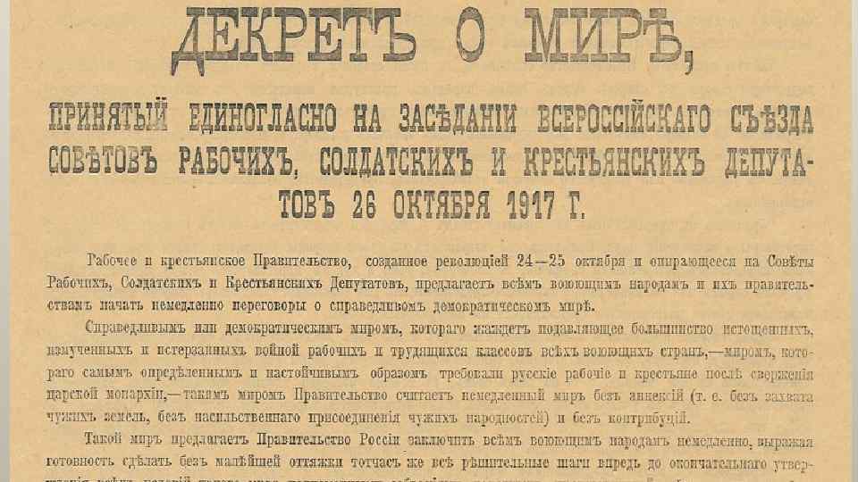 Декрет о мире «Рабочее и Крестьянское Правительство, созданное революцией 24 — 25 октября и опирающееся на Советы Рабочих, Солдатских и Крестьянских Депутатов, предлагает всем воюющим народам и их правительствам начать немедленно переговоры о справедливом, демократическом мире <…> таким миром правительство считает немедленный мир без аннексий (т. -е. без захвата чужих земель, без насильственного присоединения чужих народностей) и без контрибуций»