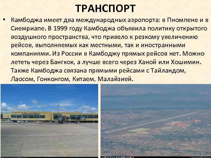 ТРАНСПОРТ • Камбоджа имеет два международных аэропорта: в Пномпене и в Сиемриапе. В 1999 году Камбоджа объявила политику открытого воздушного пространства, что привело к резкому увеличению рейсов, выполняемых как местными, так и иностранными компаниями. Из России в Камбоджу прямых рейсов нет. Можно лететь через Бангкок, а лучше всего через Ханой или Хошимин. Также Камбоджа связана прямыми рейсами с Тайландом, Лаосом, Гонконгом, Китаем, Малайзией.