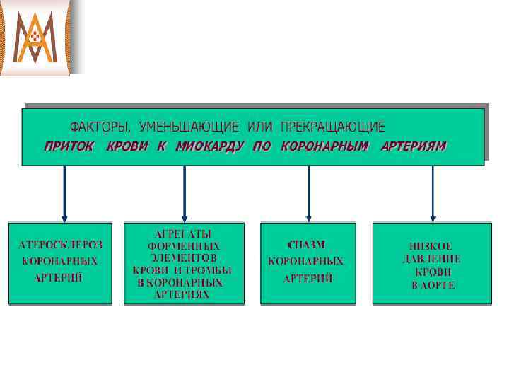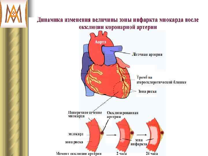 Инфаркт миокарда Ш Это патологическое состояние сердца и всего организма, которое развивается вследствие прекращения или резкого падения объемной скорости кровотока в определенных сегментах стенок сердечных камер в результате обтурации венечных артерий атеросклеротическими бляшками и тромбами.