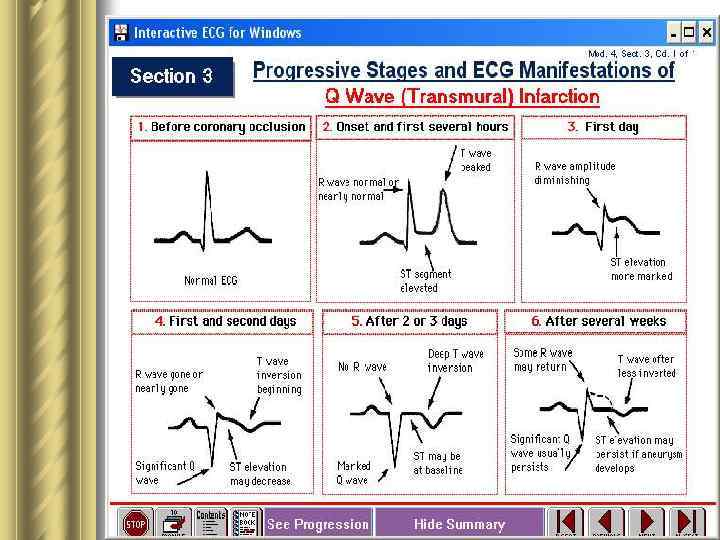 Лабораторная диагностика инфаркта миокарда 1. Периферическая кровь: нейтрофильный лейкоцитоз со сдвигом влево, эозинопения, лимфопения, ↑СОЭ; 2. БХ крови: Ш ↑содержание С-реактивного белка, гаптоглобина, ИЛ -1, ФНО (развитие ООФ); Ш ↑содержание глюкозы (следствие ↑ адреналина); Ш Метаболический ацидоз; Ш ↑фибриноген, протромбиновый индекс, ↓время свертывания (возможно развитие ДВС-синдрома); Ш Гиперкалиемия; 3. Появление в крови БХ маркеров гибели кардиомиоцитов: ↑ уровень в крови миоглобина, тропонинов, ↑активность общей КФК и особенно сердечной (КФК-МВ), ↑активность ЛДГ и АСТ (через 6 -8 ч. , максимум через 24 -36 ч. )