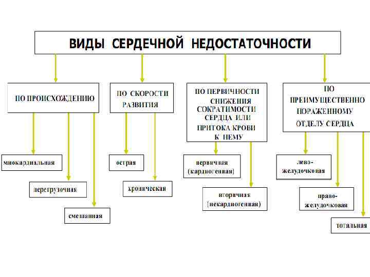 Виды сердечной недостаточности Ш I. По происхождению: Ш 1) преимущественно в результате непосредственного повреждения миокарда — «миокардиальная» ; Ш 2) преимущественно в результате перегрузки сердца — «перегрузочная» ; Ш 3) смешанная. Ш II. По первичности нарушения сократительной функции миокарда или притока венозной крови: Ш 1) первичная (кардиогенная) Ш 2) вторичная (некардиогенная) Ш III. По преимущественно пораженному отделу сердца: Ш 1) левожелудочковая; 2) правожелудочковая; 3) тотальная. Ш IV. По скорости развития: Ш 1) острая (минуты, часы); 2) хроническая (неделя, месяцы, годы).