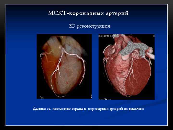 3. МСКТ – коронарография (КТ-коронарография, компьютерная коронарография) Кроме того, благодаря развитию техники в настоящее время появилась возможность выполнять коронарографию не с помощью традиционного рентгенаппарата и введения контраста в сосуды, а с использованием компьютерного томографа. В ходе МСКТ-коронарографии также производится обследование состояния сосудов и клапанов сердца. Однако для получения изображения используется не рентген-аппарат, а высокоскоростной мультиспиральный минимум 32 -срезовый компьютерный томограф. Для исследования сначала заполняют сосуды сердца контрастным веществом (соединения йода), после чего человека помещают под томограф для получения трехмерного изображения сердца. Данная процедура очень простая и быстрая, не требующая госпитализации и существенно облегчающая диагностику состояния сосудов при ИБС. Поэтому МСКТ-коронарография успешно конкурирует с традиционной коронарографией и является ее прекрасной альтернативой. МСКТ-коронарография обладает традиционной коронарографией: следующими преимуществами перед q Минимальная инвазивность; q Возможность произвести обследование госпитализации человека в стационар; в условиях поликлиники без q Более низкий риск развития осложнений; q Возможность выявить стенозы сосудов сердца; q Возможность выяснить кальцинированные); тип атеросклеротических бляшек (мягкие или q Возможность оценить состояния шунтов и стентов, наложенных в ходе
