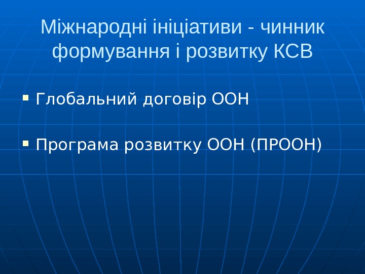 Міжнародні ініціативи — чинник формування і розвитку КСВ Глобальний договір ООН Програма розвитку ООН (ПРООН)