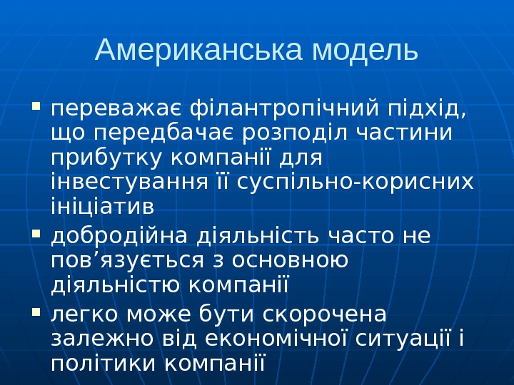 Американська модель переважає філантропічний підхід, що передбачає розподіл частини прибутку компанії для інвестування її суспільно-корисних ініціатив добродійна діяльність часто не пов’язується з основною діяльністю компанії легко може бути скорочена залежно від економічної ситуації і політики компанії