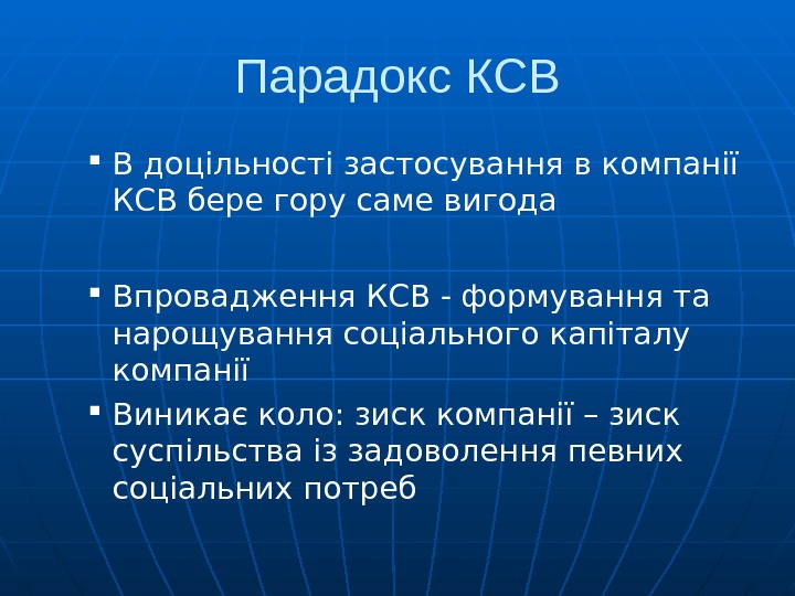 Парадокс КСВ В доцільності застосування в компанії КСВ бере гору саме вигода Впровадження КСВ — формування та нарощування соціального капіталу компанії Виникає коло: зиск компанії – зиск суспільства із задоволення певних соціальних потреб