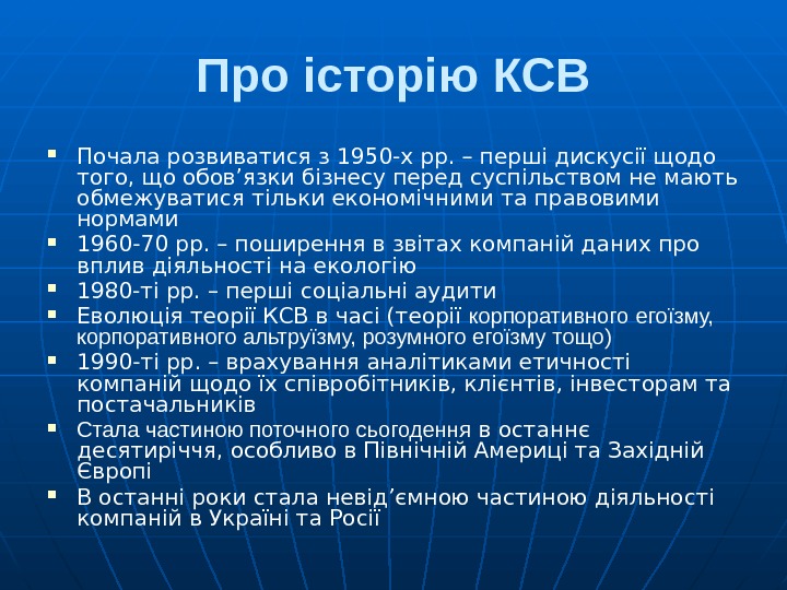 Про історію КСВ Почала розвиватися з 1950 -х рр. – перші дискусії щодо того, що обов’язки бізнесу перед суспільством не мають обмежуватися тільки економічними та правовими нормами 1960 -70 рр. – поширення в звітах компаній даних про вплив діяльності на екологію 1980 -ті рр. – перші соціальні аудити Еволюція теорії КСВ в часі (теорії корпоративного егоїзму, корпоративного альтруїзму, розумного егоїзму тощо) 1990 -ті рр. – врахування аналітиками етичності компаній щодо їх співробітників, клієнтів, інвесторам та постачальників Стала частиною поточного сьогодення в останнє десятиріччя, особливо в Північній Америці та Західній Європі В останні роки стала невід’ємною частиною діяльності компаній в Україні та Росії