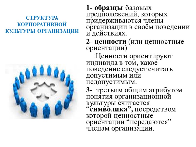 СТРУКТУРА КОРПОРАТИВНОЙ КУЛЬТУРЫ ОРГАНИЗАЦИИ 1- образцы базовых предположений, которых придерживаются члены организации в своём поведении и действиях. 2- ценности (или ценностные ориентации) Ценности ориентируют индивида в том, какое поведение следует считать допустимым или недопустимым. 3- третьим общим атрибутом понятия организационной культуры считается “символика”, посредством которой ценностные ориентации “передаются” членам организации.