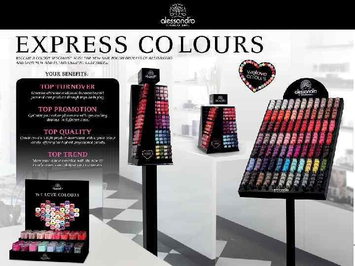 ПРЕИМУЩЕСТВА Ø НИ ОДИН БРЕНД не предлагает идентичные цвета в 3 -х разных системах Ø Удовлетворяет индивидуальные потребности клиента – применение желаемой техники Ø Последние 2 цифры артикула идентичны в каждой системе – легко ориентироваться Ø Дополнительный оборот за счет продаж идентичного цвета лака Ø Широкий ассортимент цветов