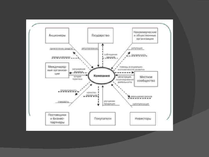 Принципы КСО • готовность компании учитывать, оценивать и обнародовать помимо основных внеэкономические показатели своей деятельности; • наличие комплексной стратегии развития компании, охватывающей экономические, социальные и экологические компоненты; • выстраивание постоянного диалогового процесса со всеми группами заинтересованных сторон, учет их интересов и требований, предъявление им результатов отчетности; • приверженность всех подразделений компании, а не только ее руководства, идеологии социальной отчетности.