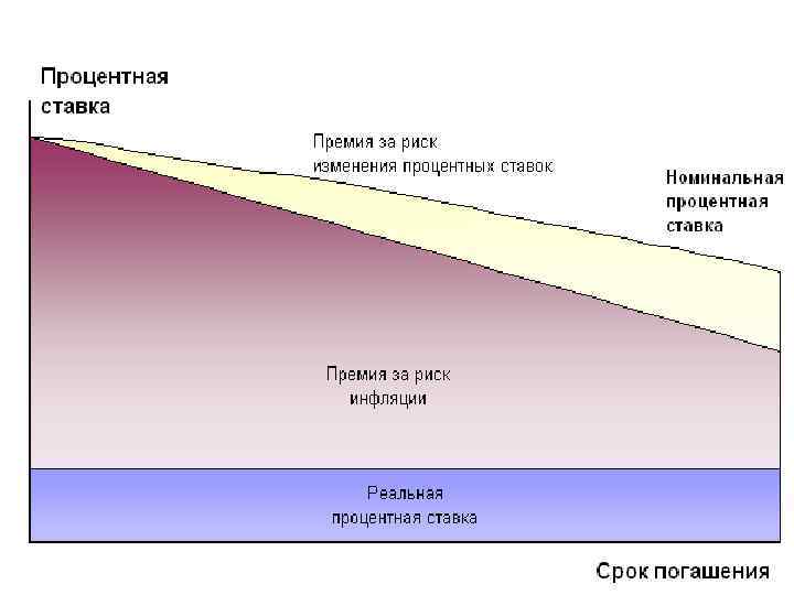 Временная структура процентных ставок. • Система взаимосвязей между процентными ставками по облигациям с различными сроками погашения, часто изображаемая в виде графика кривой доходности. Харвей (Harvey) доказывает, что за последние 30 лет обратная временная структура (т. е. ситуация, когда процентные ставки долгосрочных облигаций оказывались ниже ставок краткосрочных облигаций) всегда предшествовала снижению спроса на ценные бумаги.