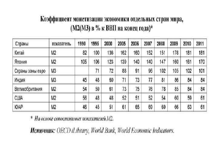 Валютно-денежный сегмент • Монетизация экономики — характеристика национальной экономики , которая отражает её насыщенность ликвидными активами. Уровень монетизации определяется развитием финансовой системы и экономики в целом. • Коэффициент монетизации экономики — показатель, равный отношению денежной массы (агрегат М 2 ) к ВВП. Данный показатель даёт представление о степени обеспеченности экономики деньгами.