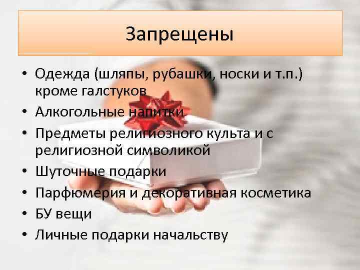 Запрещены • Одежда (шляпы, рубашки, носки и т. п. ) кроме галстуков • Алкогольные напитки • Предметы религиозного культа и с религиозной символикой • Шуточные подарки • Парфюмерия и декоративная косметика • БУ вещи • Личные подарки начальству