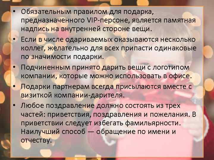 • Обязательным правилом для подарка, предназначенного VIP-персоне, является памятная надпись на внутренней стороне вещи. • Если в числе одариваемых оказываются несколько коллег, желательно для всех припасти одинаковые по значимости подарки. • Подчиненным принято дарить вещи с логотипом компании, которые можно использовать в офисе. • Подарки партнерам всегда присылаются вместе с визиткой компании-дарителя. • Любое поздравление должно состоять из трех частей: приветствия, поздравления и пожелания. В приветствии следует избегать фамильярности. Наилучший способ — обращение по имени и отчеству.