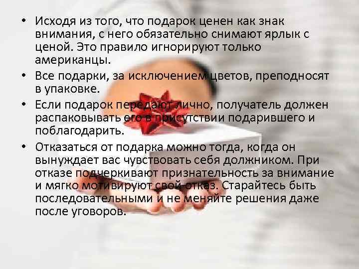 • Исходя из того, что подарок ценен как знак внимания, с него обязательно снимают ярлык с ценой. Это правило игнорируют только американцы. • Все подарки, за исключением цветов, преподносят в упаковке. • Если подарок передают лично, получатель должен распаковывать его в присутствии подарившего и поблагодарить. • Отказаться от подарка можно тогда, когда он вынуждает вас чувствовать себя должником. При отказе подчеркивают признательность за внимание и мягко мотивируют свой отказ. Старайтесь быть последовательными и не меняйте решения даже после уговоров.
