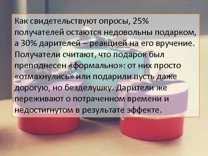 Как свидетельствуют опросы, 25% получателей остаются недовольны подарком, а 30% дарителей – реакцией на его вручение. Получатели считают, что подарок был преподнесен «формально» : от них просто «отмахнулись» или подарили пусть даже дорогую, но безделушку. Дарители же переживают о потраченном времени и недостигнутом в результате эффекте.