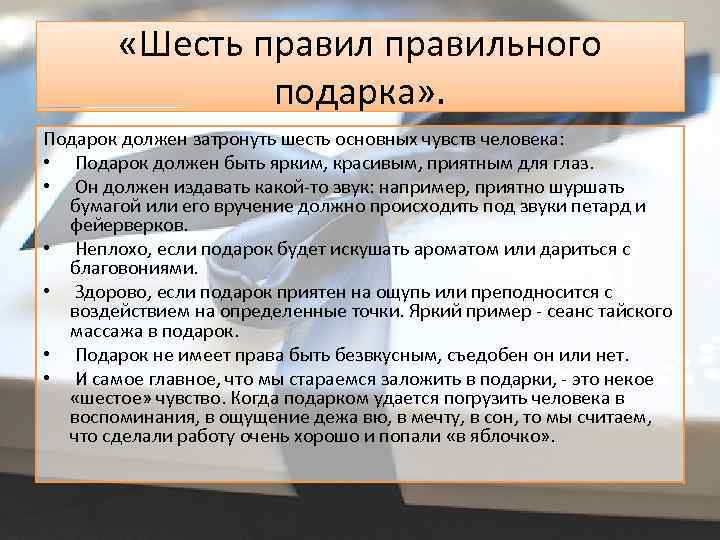 «Шесть правильного подарка» . Подарок должен затронуть шесть основных чувств человека: • Подарок должен быть ярким, красивым, приятным для глаз. • Он должен издавать какой-то звук: например, приятно шуршать бумагой или его вручение должно происходить под звуки петард и фейерверков. • Неплохо, если подарок будет искушать ароматом или дариться с благовониями. • Здорово, если подарок приятен на ощупь или преподносится с воздействием на определенные точки. Яркий пример - сеанс тайского массажа в подарок. • Подарок не имеет права быть безвкусным, съедобен он или нет. • И самое главное, что мы стараемся заложить в подарки, - это некое «шестое» чувство. Когда подарком удается погрузить человека в воспоминания, в ощущение дежа вю, в мечту, в сон, то мы считаем, что сделали работу очень хорошо и попали «в яблочко» .