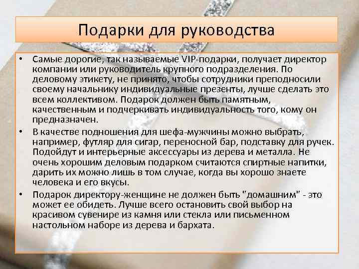 Подарки для руководства • Самые дорогие, так называемые VIP-подарки, получает директор компании или руководитель крупного подразделения. По деловому этикету, не принято, чтобы сотрудники преподносили своему начальнику индивидуальные презенты, лучше сделать это всем коллективом. Подарок должен быть памятным, качественным и подчеркивать индивидуальность того, кому он предназначен. • В качестве подношения для шефа-мужчины можно выбрать, например, футляр для сигар, переносной бар, подставку для ручек. Подойдут и интерьерные аксессуары из дерева и металла. Не очень хорошим деловым подарком считаются спиртные напитки, дарить их можно лишь в том случае, когда вы хорошо знаете человека и его вкусы. • Подарок директору-женщине не должен быть "домашним" - это может ее обидеть. Лучше всего остановить свой выбор на красивом сувенире из камня или стекла или письменном настольном наборе из дерева и бархата.