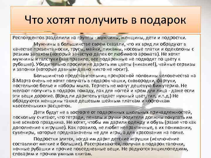 Что хотят получить в подарок Респондентов разделили на группы - мужчины, женщины, дети и подростки. Мужчины в большинстве своем сказали, что их вряд ли обрадуют в качестве презента носки, трусы, майки, пижамы, носовые платки и одеколоны с резким запахом (который зачастую далек от любимого аромата). Не хотят мужчины и галстуки (как правило, все подаренные не подходят по цвету к рубашке). Убедительно просили не дарить им цветы (никакие!), чайные сервизы и запонки (которые давным-давно никто не носит). Большинство представительниц прекрасной половины человечества на 8 Марта очень не хотят получать в подарок чашки, сковородки, фартуки, постельное белье и наборы мыла. Терпеть не могут дешевую бижутерию. Не желают получить в подарок помаду, лак для ногтей и крем для лица - даже если эти вещи дорогие. (Вряд ли даритель угадает нужный цвет, тип, и. т. д. ) Не обрадуются женщины также дешевым шейным платкам и кофточкам «веселеньких» расцветок. Дети будут не в восторге от подаренных школьных принадлежностей, поскольку считают, что тетради, пеналы и ручки родители должны покупать им вне всякого праздника. Не хотят, чтобы им дарили одежду и обувь (разве что как дополнение к игрушке). Как правило, не любят непрактичные, в их понимании, сувениры, которые предназначены не для игры, а для красования на полке. Подростки злятся, когда им дарят детские игрушки (исключение составляют мягкие и большие). Расстраиваются, получая в подарок тапочки, ночные рубашки и прочие повседневные вещи. Не радуются энциклопедиям, словарям и прочим умным книгам.