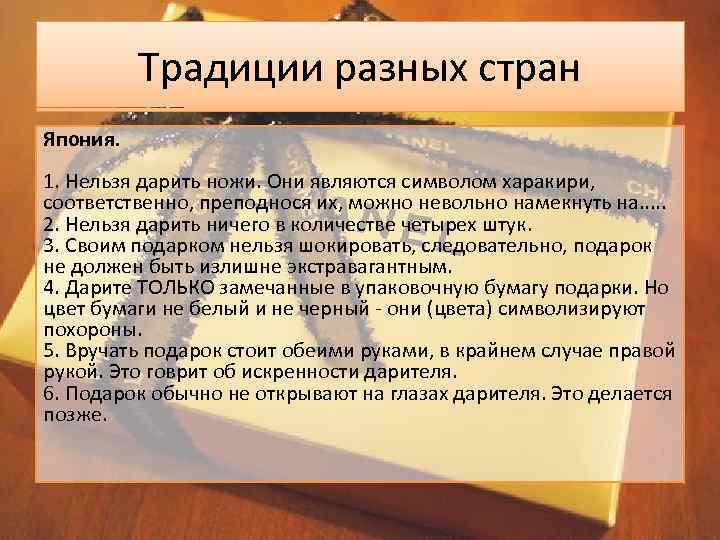 Традиции разных стран Япония. 1. Нельзя дарить ножи. Они являются символом харакири, соответственно, преподнося их, можно невольно намекнуть на. . . 2. Нельзя дарить ничего в количестве четырех штук. 3. Своим подарком нельзя шокировать, следовательно, подарок не должен быть излишне экстравагантным. 4. Дарите ТОЛЬКО замечанные в упаковочную бумагу подарки. Но цвет бумаги не белый и не черный - они (цвета) символизируют похороны. 5. Вручать подарок стоит обеими руками, в крайнем случае правой рукой. Это говрит об искренности дарителя. 6. Подарок обычно не открывают на глазах дарителя. Это делается позже.
