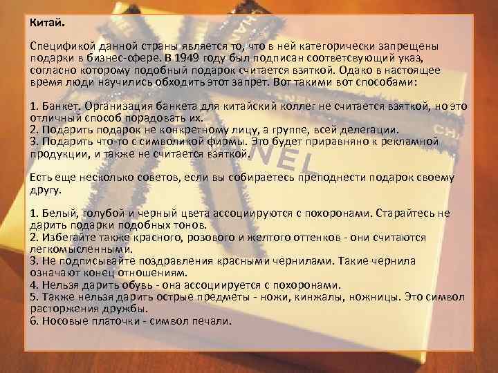 Китай. Спецификой данной страны является то, что в ней категорически запрещены подарки в бизнес-сфере. В 1949 году был подписан соответсвующий указ, согласно которому подобный подарок считается взяткой. Одако в настоящее время люди научились обходить этот запрет. Вот такими вот способами: 1. Банкет. Организация банкета для китайский коллег не считается взяткой, но это отличный способ порадовать их. 2. Подарить подарок не конкретному лицу, а группе, всей делегации. 3. Подарить что-то с символикой фирмы. Это будет приравняно к рекламной продукции, и также не считается взяткой. Есть еще несколько советов, если вы собираетесь преподнести подарок своему другу. 1. Белый, голубой и черный цвета ассоциируются с похоронами. Старайтесь не дарить подарки подобных тонов. 2. Избегайте также красного, розового и желтого оттенков - они считаются легкомысленными. 3. Не подписывайте поздравления красными чернилами. Такие чернила означают конец отношениям. 4. Нельзя дарить обувь - она ассоциируется с похоронами. 5. Также нельзя дарить острые предметы - ножи, кинжалы, ножницы. Это символ расторжения дружбы. 6. Носовые платочки - символ печали.