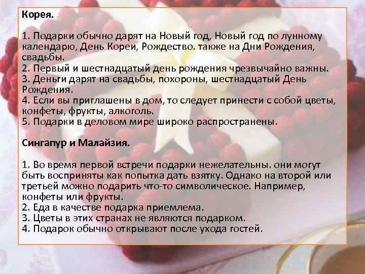 Корея. 1. Подарки обычно дарят на Новый год, Новый год по лунному календарю, День Кореи, Рождество. также на Дни Рождения, свадьбы. 2. Первый и шестнадцатый день рождения чрезвычайно важны. 3. Деньги дарят на свадьбы, похороны, шестнадцатый День Рождения. 4. Если вы приглашены в дом, то следует принести с собой цветы, конфеты, фрукты, алкоголь. 5. Подарки в деловом мире широко распространены. Сингапур и Малайзия. 1. Во время первой встречи подарки нежелательны. они могут быть восприняты как попытка дать взятку. Однако на второй или третьей можно подарить что-то символическое. Например, конфеты или фрукты. 2. Еда в качестве подарка приемлема. 3. Цветы в этих странах не являются подарком. 4. Подарок обычно открывают после ухода гостей.