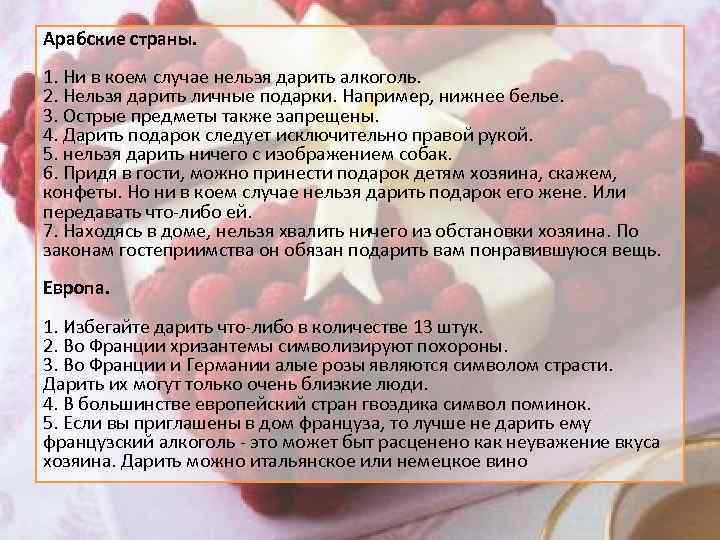 Арабские страны. 1. Ни в коем случае нельзя дарить алкоголь. 2. Нельзя дарить личные подарки. Например, нижнее белье. 3. Острые предметы также запрещены. 4. Дарить подарок следует исключительно правой рукой. 5. нельзя дарить ничего с изображением собак. 6. Придя в гости, можно принести подарок детям хозяина, скажем, конфеты. Но ни в коем случае нельзя дарить подарок его жене. Или передавать что-либо ей. 7. Находясь в доме, нельзя хвалить ничего из обстановки хозяина. По законам гостеприимства он обязан подарить вам понравившуюся вещь. Европа. 1. Избегайте дарить что-либо в количестве 13 штук. 2. Во Франции хризантемы символизируют похороны. 3. Во Франции и Германии алые розы являются символом страсти. Дарить их могут только очень близкие люди. 4. В большинстве европейский стран гвоздика символ поминок. 5. Если вы приглашены в дом француза, то лучше не дарить ему французский алкоголь - это может быт расценено как неуважение вкуса хозяина. Дарить можно итальянское или немецкое вино