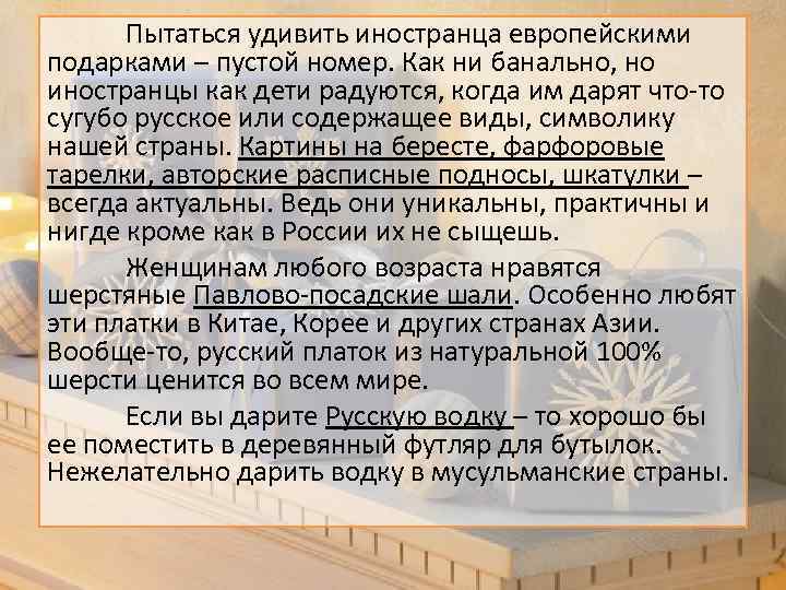 Пытаться удивить иностранца европейскими подарками – пустой номер. Как ни банально, но иностранцы как дети радуются, когда им дарят что-то сугубо русское или содержащее виды, символику нашей страны. Картины на бересте, фарфоровые тарелки, авторские расписные подносы, шкатулки – всегда актуальны. Ведь они уникальны, практичны и нигде кроме как в России их не сыщешь. Женщинам любого возраста нравятся шерстяные Павлово-посадские шали. Особенно любят эти платки в Китае, Корее и других странах Азии. Вообще-то, русский платок из натуральной 100% шерсти ценится во всем мире. Если вы дарите Русскую водку – то хорошо бы ее поместить в деревянный футляр для бутылок. Нежелательно дарить водку в мусульманские страны.