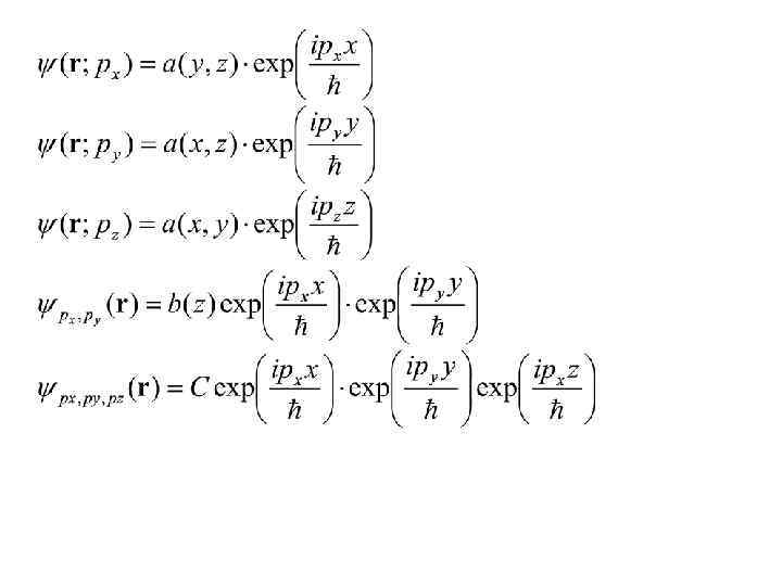 Принцип суперпозиции (постулат) 1) Если система в данный момент времени в принципе может находиться в состояниях с волновыми функциями ψ1 и ψ2, то невырожденная линейная комбинация ψ=С 1ψ1+С 2ψ2 также является волновой функцией, описывающей возможное состояние системы. 2) Если в данный момент времени некая физическая величина в состоянии с волновой функцией ψ1 имеет определенное значение равное f 1, в состоянии с волновой функцией ψ2 она имеет определенное значение равное f 2, то в состоянии с волновой функцией ψ=С 1ψ1+С 2ψ2, измерение данной физической величины в этот момент времени будет давать или значение f 1, или значение f 2. Причем вероятность получить значение f 1 пропорциональна |C 1|2, а вероятность получить значение f 2 пропорциональна |C 2|2 3) Если система в принципе может находиться в состояниях движения с волновыми функциями ψ1(q, t) и ψ2(q, t), то невырожденная линейная комбинация ψ(q, t) =С 1ψ1(q, t) +С 2ψ2 (q, t) также является волновой функцией, описывающей возможное состояние движения системы.