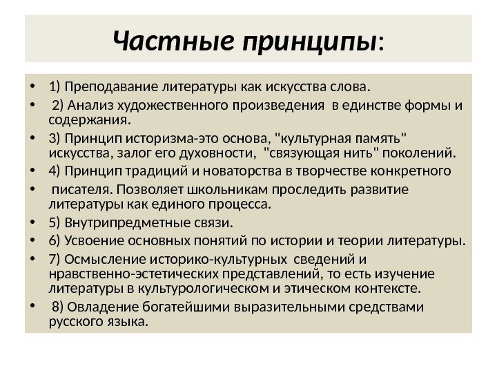Частные принципы : • 1) Преподавание литературы как искусства слова. • 2) Анализ художественного произведения в единстве формы и содержания. • 3) Принцип историзма-это основа, «культурная память» искусства, залог его духовности, «связующая нить» поколений. • 4) Принцип традиций и новаторства в творчестве конкретного • писателя. Позволяет школьникам проследить развитие литературы как единого процесса. • 5) Внутрипредметные связи. • 6) Усвоение основных понятий по истории и теории литературы. • 7) Осмысление историко-культурных сведений и нравственно-эстетических представлений, то есть изучение литературы в культурологическом и этическом контексте. • 8) Овладение богатейшими выразительными средствами русского языка.