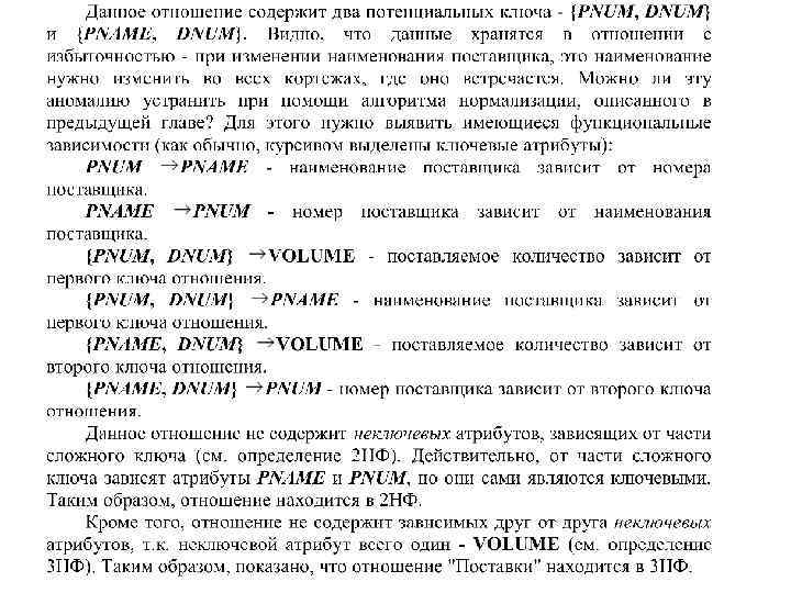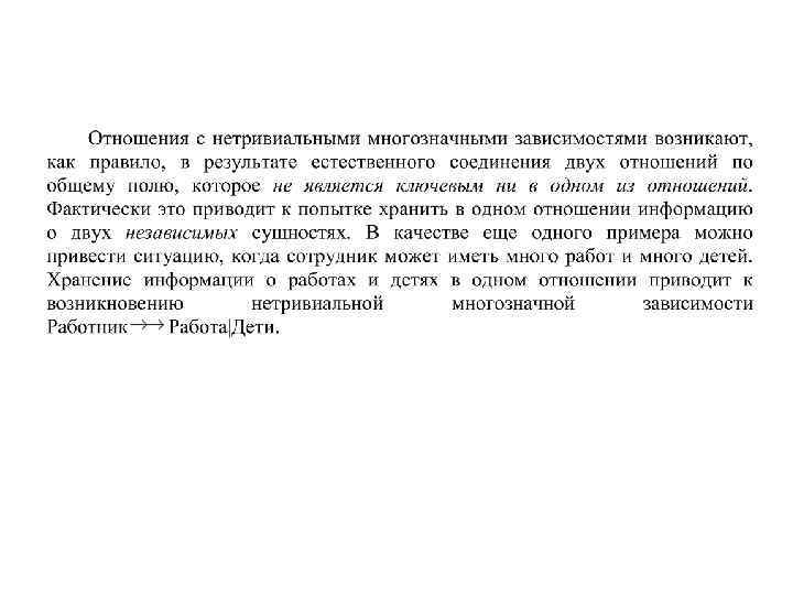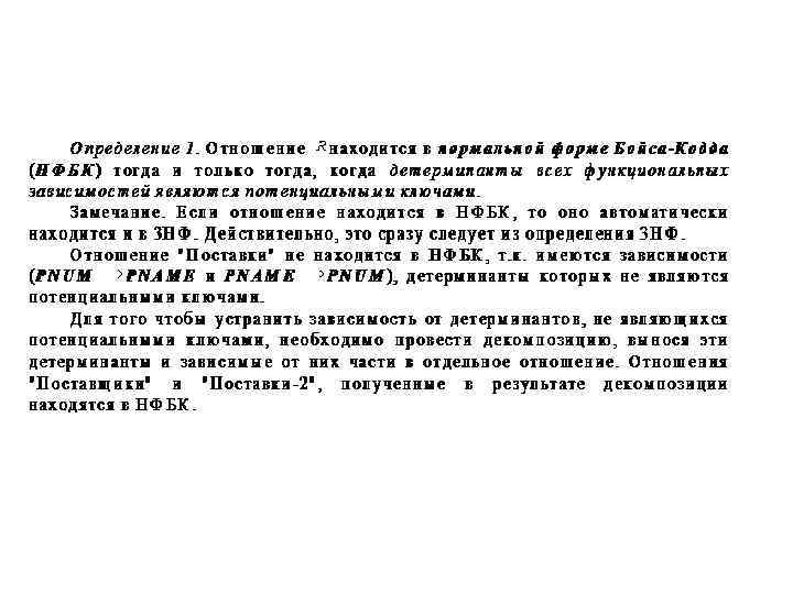 Первая нормальная форма (1 НФ) - это обычное отношение. Отношение в 1 НФ обладает следующими свойствами: • В отношении нет одинаковых кортежей. • Кортежи не упорядочены. • Атрибуты не упорядочены. • Все значения атрибутов атомарны. Отношения, находящиеся в 1 НФ являются "плохими" в том смысле, что они не удовлетворяют выбранным критериям имеется большое количество аномалий обновления, для поддержания целостности базы данных требуется разработка сложных триггеров. Отношение находится во второй нормальной форме (2 НФ) тогда и только тогда, когда отношение находится в 1 НФ и нет неключевых атрибутов, зависящих от части сложного ключа. Отношения в 2 НФ "лучше", чем в 1 НФ, но еще недостаточно "хороши" - остается часть аномалий обновления, попрежнему требуются триггеры, поддерживающие целостность базы данных.