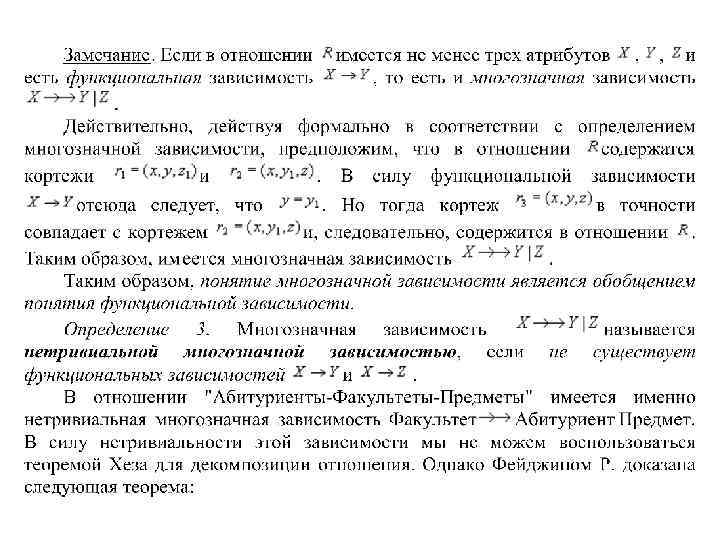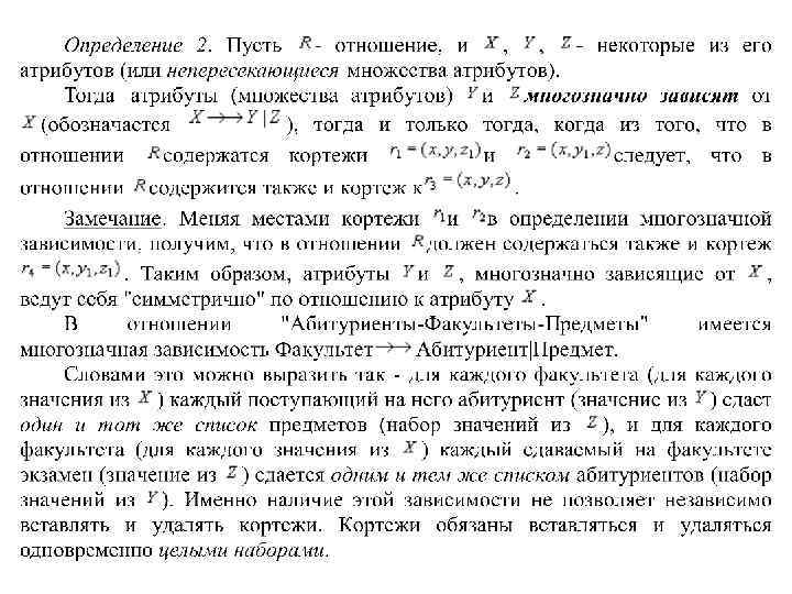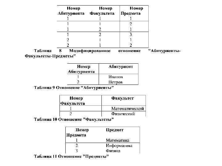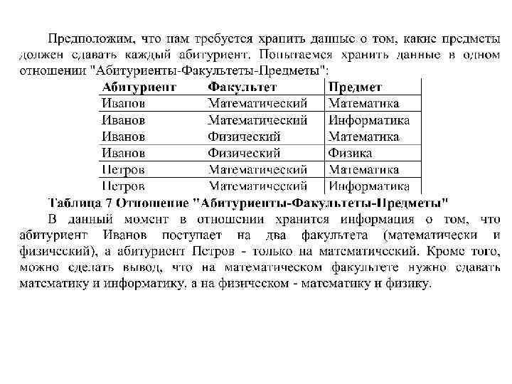 4 НФ (Четвертая Нормальная Форма) Рассмотрим следующий пример. Пусть требуется учитывать данные об абитуриентах, поступающих в ВУЗ. При анализе предметной области были выделены следующие требования: • Каждый абитуриент имеет право сдавать экзамены на несколько факультетов одновременно. • Каждый факультет имеет свой список сдаваемых предметов. • Один и тот же предмет может сдаваться на нескольких факультетах. • Абитуриент обязан сдавать все предметы, указанные для факультета, на который он поступает, несмотря на то, что он, может быть, уже сдавал такие же предметы на другом факультете.