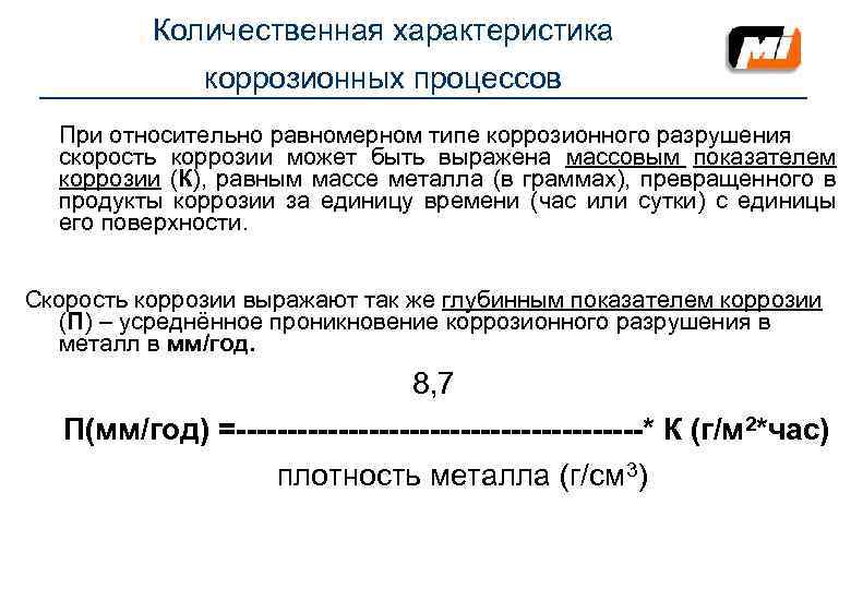 Количественная характеристика коррозионных процессов При относительно равномерном типе коррозионного разрушения скорость коррозии может быть выражена массовым показателем коррозии (К), равным массе металла (в граммах), превращенного в продукты коррозии за единицу времени (час или сутки) с единицы его поверхности. Скорость коррозии выражают так же глубинным показателем коррозии (П) – усреднённое проникновение коррозионного разрушения в металл в мм/год. 8, 7 П(мм/год) =--------------------* К (г/м 2*час) плотность металла (г/см 3)