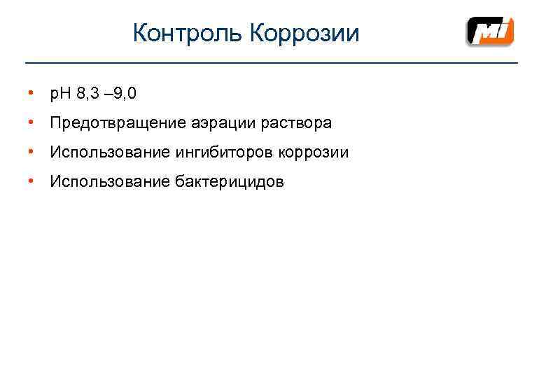 Контроль Коррозии • р. Н 8, 3 – 9, 0 • Предотвращение аэрации раствора • Использование ингибиторов коррозии • Использование бактерицидов