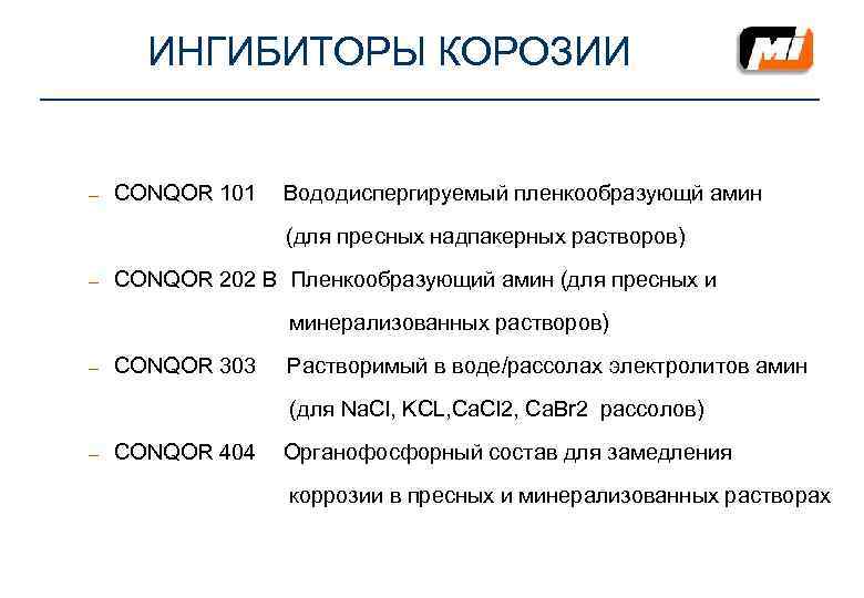 ИНГИБИТОРЫ КОРОЗИИ – CONQOR 101 Вододиспергируемый пленкообразующй амин (для пресных надпакерных растворов) – CONQOR 202 B Пленкообразующий амин (для пресных и минерализованных растворов) – CONQOR 303 Растворимый в воде/рассолах электролитов амин (для Na. Cl, KCL, Ca. Cl 2, Ca. Br 2 рассолов) – CONQOR 404 Органофосфорный состав для замедления коррозии в пресных и минерализованных растворах