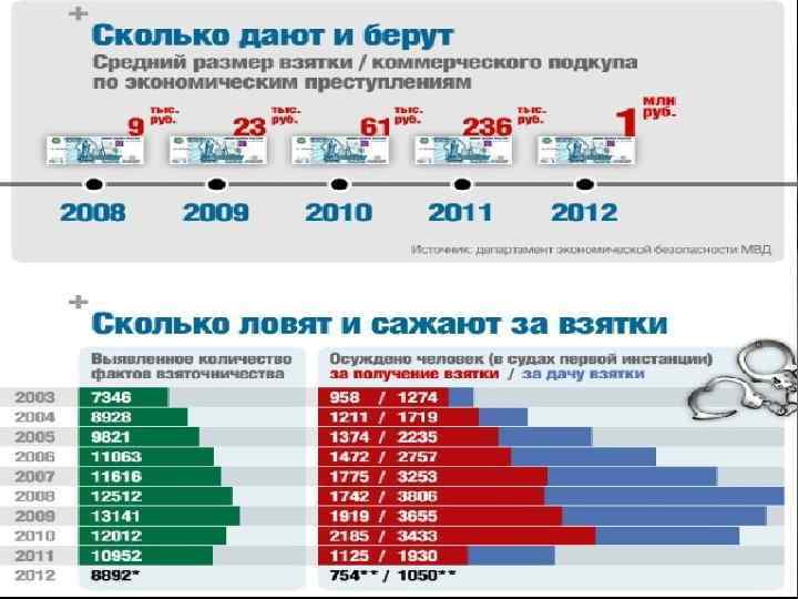 СТАТИСТИКА Ущерб от коррупционных преступлений в России за 2012 год оценивается почти в 21 миллиард рублей и 1500 тысячи это система ЖКХ. Установлено свыше 49 тысяч посягательств, что почти на четверть превышает уровень 2011 года, на 13 процентов больше установлено лиц, совершивших такие деяния» . Число преступлений, причинивших крупный и особо крупный ущерб, выросло еще сильнее — на 80%. Уголовному преследованию подверглись более 800 лиц особого правового статуса (в том числе около 600 депутатов, выборных глав муниципальных образований и органов местного самоуправления). Фигурантами уголовных дел стали 15 следователей СК и шестеро судей. И все эти цифры (относящиеся к зарегистрированным преступлениям) не отражают реальный объем коррупции. Тема коррупции в Минобороны о мошенничестве в холдинге «Оборонсервис» составлено из 25 дел, объединенных в одно производство. Сумма ущерба по этому делу оценивается в 5 миллиардов рублей, хотя один миллиард уже возвращен в бюджет, но общая сумма ущерба от преступлений в этой сфере в 2012 году составила 10, 7 миллиарда рублей.