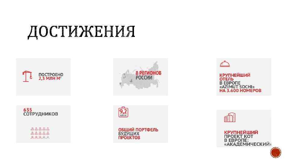 § "КОРТРОС" сегодня - это 8 регионов присутствия, куда мы тиражируем подход, а не Проекты. Мы стремимся к тому, чтобы в головах людей "КОРТРОС" вызывал четкие ассоциации. § Надежность. Вы должны знать, что мы никогда не замораживали строек, и у нас никогда не было обманутых дольщиков. "КОРТРОС" наращивал объемы строительства тогда, когда прочие их сокращали. Это позволило компании серьезно продвинуться на рынке. § Новации. Мы действовали нестандартно, поступались маржинальностью, работали на перспективу. § Наш горизонт планирования - годы, по некоторым проектам - десятилетия. У нас "длинные" кредиты и долгосрочное проектное финансирование. Это позволяет избежать многих сложностей, связанных с макроэкономической ситуацией. Именно поэтому нам доверяют крупные инвесторы и рядовые покупатели. Обратитесь к нашим партнерам и вы убедитесь: мы работаем с ведущими мировыми архитектурными бюро, застройщиками, субподрядчиками и поставщиками. Нам и нашими клиентам доверяют крупнейшие банки. § Мы действительно одни из немногих на рынке, кто продвигает проекты Государственно-частного партнерства. Комплексное освоение территорий. Мы не только разработали и внедрили принципиально новый подход, мы стали новаторами в этом перспективном направлении, предложив совершенно уникальные проекты зеленого и энергоэффективного строительства, наполнение пространства социальной инфраструктурой. Группа компаний "КОРТРОС", а это именно Группа - с четкой и понятной структурой, никогда не продавала квадратные метры. § "КОРТРОС" создавал и создает новое пространство и качественные условия для жизни людей. Все это предмет гордости тех, кто над этим работал все последние годы.
