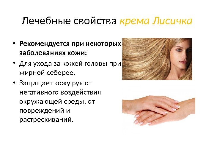 Лечебные свойства крема Лисичка • Рекомендуется при некоторых заболеваниях кожи: • Для ухода за кожей головы при жирной себорее. • Защищает кожу рук от негативного воздействия окружающей среды, от повреждений и растрескиваний.