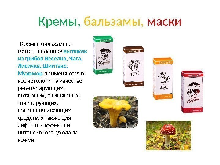 Кремы, бальзамы, маски Кремы, бальзамы и маски на основе вытяжек из грибов Веселка, Чага, Лисичка, Шиитаке, Мухомор применяются в косметологии в качестве регенерирующих, питающих, очищающих, тонизирующих, восстанавливающих средств, а также для лифтинг — эффекта и интенсивного ухода за кожей.