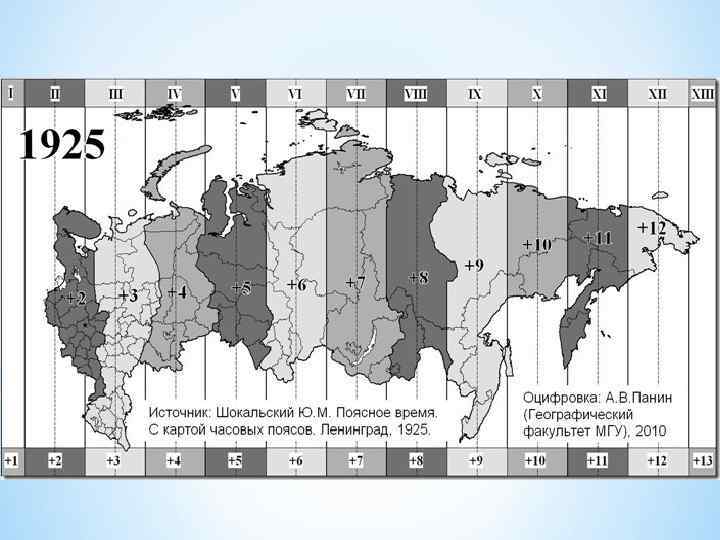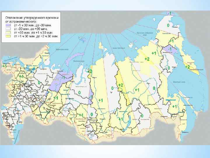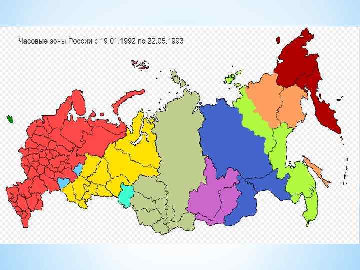 * * В 1919 году Совет народных комиссаров РСФСР постановил разделить страну на 11 часовых поясов, границы которых в европейской части и в Западной Сибири были проведены в основном по рекам и железным дорогам. Фактически система часовых поясов была введена на всей территории РСФСР и СССР в 1924 году. Впоследствии границы часовых поясов пересматривались с учётом местной топографии и прохождения административных границ в 1956, в 1980 и в 1992 году. Намного чаще, особенно после 1956 года, происходили события, когда субъекты (или часть территории субъекта) начинали применять у себя местное время соседнего (в основном, западного) часового пояса, но это не считалось изменением границ часовых поясов. Значительная часть таких событий была оформлена в виде допущений в постановлении правительства от 8 января 1992.